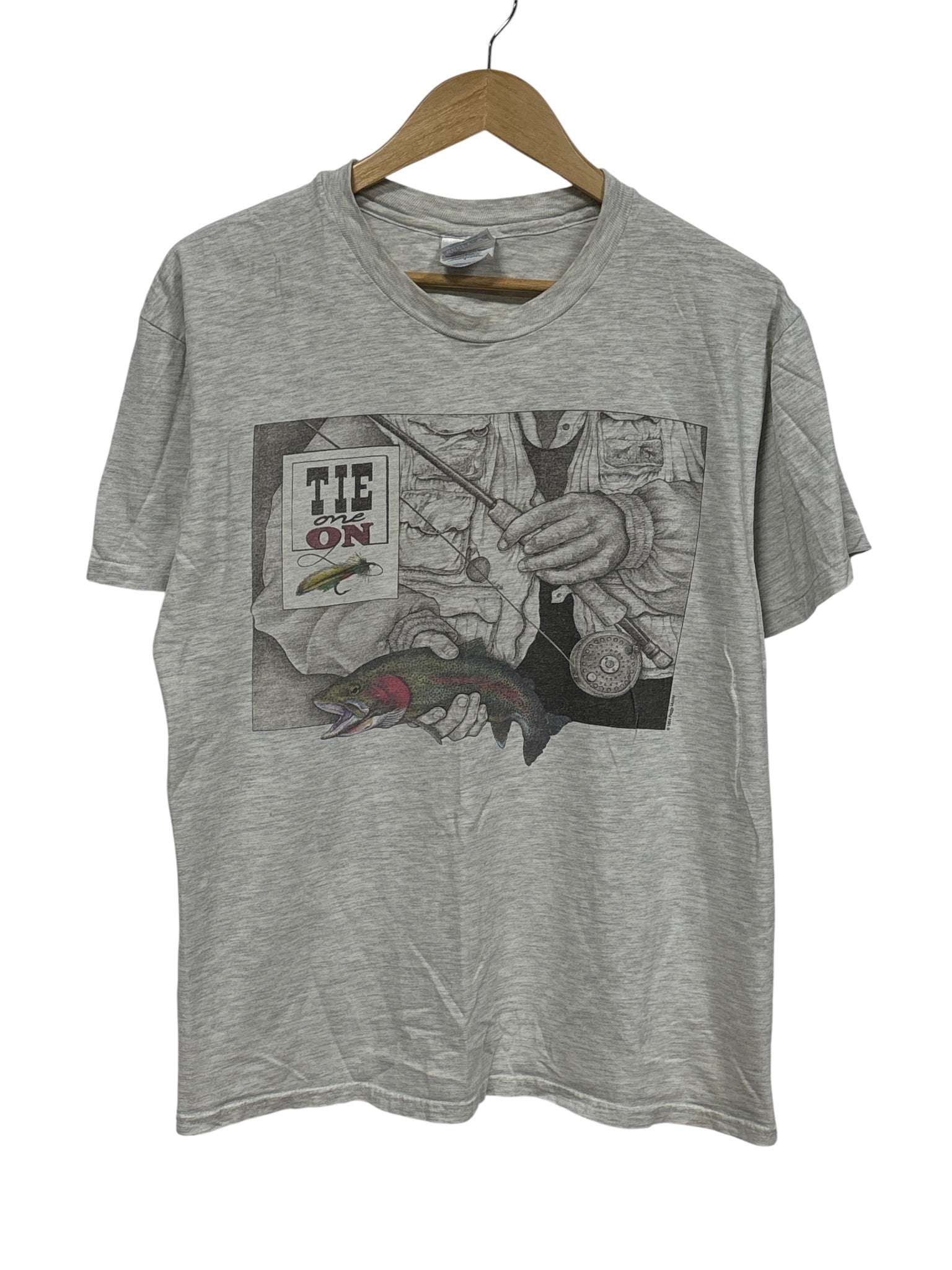 Vintage 90's Tie One On Fly Fishing Graphic Tee Size Large